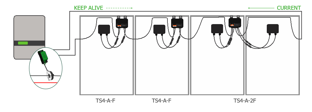所以,你只需要使用其中一個極性,要麼把所有的正極或所有的負極通過它,發射器就會把這個"保持活動"信號感應到那個導體上,用於電力線通信。只要TS4-F和-2F器件看到這個"保持活動"信號,它們就會允許陣列、電壓和電流通過它們。