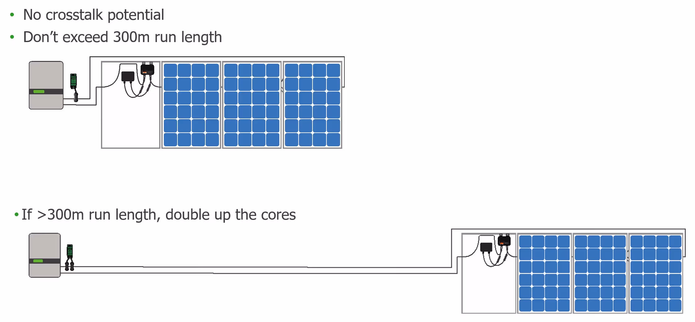 所以在這裡,我們有多個字串,多個陣列,多個逆變器。同樣,只需將所有內容分開,就像這樣(在圖 13 中左側)。不要這樣做(在圖 13 中);你不會把所有東西都放在一起,因為你會得到串音。